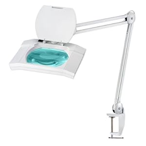 Product Description : As we age, our eyes naturally lose some of their ability to focus close-in. A teenager can focus on objects as close as 3" but by age 50 that distance can increase to 18" - VERY frustrating when it limits your work or hobby. This premium-grade lamp is a simple and effective solution for seeing almost anything bigger, better and brighter. 36" triple-joint arm has unique internal cantilever system (not external springs like lesser lamps) that lets you adjust without loosening/tightening knobs - perfectly balanced to hold position (can be locked in position if necessary). Heavy-duty die-cast aluminum clamp with no-mark pad, nickel-plated steel screw fits surfaces to 2-1/2"-thick; easy to move remove and takes up just 2" of desk space. Extra-large 7.5" x 6.2" glass lens with 5-diopter (2.25X) magnification lets you see fine detail clearly but still has a practical focal range (distance of text or object from lens) of up to 7". 108 individual super-bright LED illuminate with pure white light without the heat build-up of incandescent or halogen and without the flicker of fluorescent. Consumes less than 8-watts power with estimated life of 100,000 hours. Conveniently-placed power switch on top of lamp head so it's easy to reach. Overall length 48", weight 11 lbs 72" 18AWG UL-listed power cord.