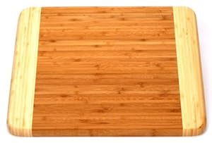 Product Description : : Thanks to the naturally occurring strength and hardness of bamboo, this material resists blade damage and as a result makes an excellent cutting surface. The board won't stain or fade and uses only food-safe, formaldehyde-free glue for assembly. Measuring 11-1/2 by 14-1/2 inches with a 5/8-inch thickness, the rectangular board ably provides enough room for chopping comfortably while still being lightweight enough to easily transport food to the stove. For those who are environmentally minded, the abundance and renewable nature of bamboo makes it an earth-friendly choice. This attractive piece boasts a body of darker material with two ends made of a contrasting bamboo in a lighter hue. All edges are rounded and the piece should be hand washed. Did you know that bamboo is 16% harder than maple? Did you know that bamboo is actually a grass, not a tree, that can be harvested after only three to four years? Some species grow nearly two feet in a single day. It has an extensive root system, new shoots are continually sent up so it never requires replanting. This makes bamboo a sustainable, cost effective, and ecologically responsible alternative to the use of hardwoods for home products such as cutting boards. The beautiful colors of this board are natural and permanent. Through a specialized heating process the natural sugar in the wood is caramelized to produce the gorgeous honey tones.