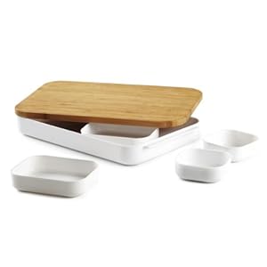 Product Description : : The Bento cut-and-prep set by Umbra is an all-in-one food preparation system for the modern kitchen. This ingenious seven-piece set includes one cutting board, five prep bowls of varying sizes, and one tray/storage base that all work together as a streamlined solution with a space-saving design. Constructed of solid bamboo, the 11-inch by 16-inch cutting board features a juice groove on one side for catching drips and crumbs. The five handy prep-bowls are constructed of durable, BPA-free molded material and double as measuring cups: two 1-cup, two 2-cup, and one 3-cup, complete with measurement conversions and squared-off corners for easy pouring. The storage base, made of the same material as the bowls, features non-slip feet for stability and does double-duty as a useful, multi-purpose tray. Bento's design incorporates an overhanging ledge that enables the prep-bowls to be tucked under the edge of the cutting board, for easy transfer of food from board to bowl. When not in use, all pieces nest together for convenient, compact storage. Use Bento to more easily prepare a dish with multiple ingredients. Quickly and neatly sort chopped ingredients, set aside trimmings and scraps, reserve juices, cut and serve garnishes and snacks. Bento measures by 16-inch by 11-inch by 3-inch overall when nested. Coordinates with the Slice bread box also by Umbra. Designed by Atlason for Umbra - the worldwide leader in innovative, modern, casual and affordable design for the home.