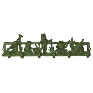 Product Description : You'll smile every time you use it. This rustic wall hook features five musical frogs with five hooks. Made of sturdy caste iron with green paint highlights, it measures 17" x 5" x 2.5".
