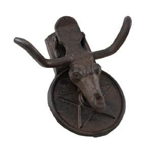 Product Description : This beautiful cast iron 3 dimensional longhorn steer head door knocker is an excellent addition to the front doors of Western decor lovers. It is finished with a brown enamel that mimics rust, and gives the knocker an aged look. The knocker measures 6 inches tall, 6 inches wide, 2 1/4 inches thick, and has 2 screw holes in the Western star-shaped mounting plate for mounting to your door. It has wonderful detail and the aged finish looks great on any color door. The mount doubles as a striker protector, so it won't mar your door.